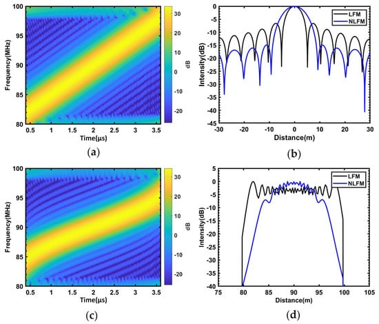 (a) Time-frequency spectra of LFM; (b) compressed pulses; (c) time-frequency spectra of NLFM; (d) relative frequency spectra of LFM and NLFM.