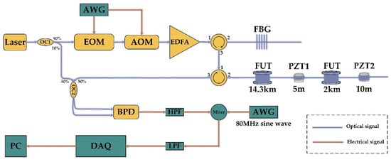 As shown in Figure 4, the experimental setup utilizes a narrow-linewidth laser (TeraXion, SFFL-N-34 (Quebec City, QC, Canada)) with a central wavelength of 1550.2387 nm and a linewidth of 1.035 KHz. The laser output is split into local light and signal light using a 10:90 coupler. The signal light is intensity-modulated into an OFDM-NLFM signal using an electro-optic modulator (EOM, JDSU, X5 (Singapore)). This signal consists of 4 subcarriers, each with an NLFM signal with a sweeping bandwidth of 20 MHz. An acousto-optic modulator (AOM, Gooch & Housego, T-M080 (Ilminster, UK)) is used for sideband suppression and a frequency shift of 80 MHz. The modulated pulse light is then amplified by an erbium-doped fiber amplifier (EDFA). It passes through a circulator and then enters a grating filter to filter out the amplifier’s spontaneous emission noise. Subsequently, the light enters another circulator and travels through approximately 16.3 km of optical fiber. At around 14.3 km, the first piezoelectric transducer (PZT) with 5 m of wound optical fiber is positioned. Following this, it is connected to a 2 km-long optical fiber spool. A second PZT, which also has 5 m of wound optical fiber, is placed. Finally, there is a remaining 20 m of tail fiber at the end. The fiber generates backward Rayleigh scattering signals. These signals, along with the local light, are combined in the circulator. The beating frequency signal is detected using a balanced photodetector (BPD, MBD-200M-A) with a bandwidth of 200 MHz.