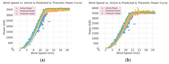 The designated power of the wind turbine indicated the maximum limit of the turbine’s power production, which was determined by the producer and authorised during the developmental stage. In Figure 5, theoretical and active power curves are presented visually. The theoretical power curve, otherwise referred to as the power–performance curve or simply the power curve, is a visual representation that elucidates the correlation between the wind speed and the power output of a wind turbine. Under ideal circumstances, it showcases the maximum quantity of power that a wind turbine can produce at varying wind speeds. Active power, frequently called absolute power, constitutes a fundamental concept in electrical engineering and power systems. It embodies the authentic power that a wind turbine generates in this study.