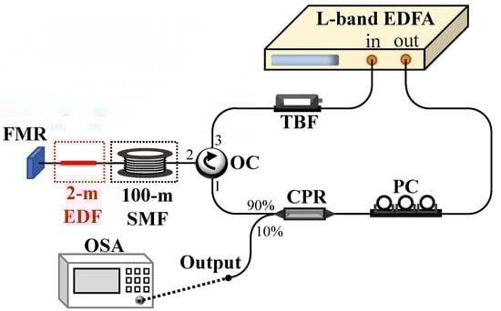 Optical setup of first presented L-band EDF ring laser. PC: polarization controller; OC: optical circulator; EDF: erbium-doped fiber; FMR: fiber mirror reflector; CPR: 10:90 and 1 × 2 optical coupler; TBF: tunable bandpass filter; SMF: single-mode fiber; OSA: optical spectrum analyzer; EDFA: erbium-doped fiber amplifier.
