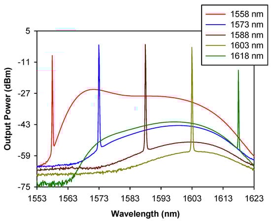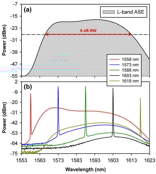 First, the initial amplified spontaneous emission (ASE) curve of L-band EDFA measured was in the wavelength scope from 1553 to 1563 nm, as exhibited in Figure 2a. In the observation, the L-band ASE spectrum seemed relatively flat. The 6 dB bandwidth (BW) of the ASE spectrum was in the range from 1568.0 to 1609.5 nm (BW ≅ 41.5 nm). The 6 dB ASE bandwidth was close to the operative gain range of L-band EDFA (1568 to 1604 nm). When we initially adjusted the passband of TBF, the output wavelength of the proposed EDF laser configuration was generated from 1558.0 nm. Hence, all the output wavelengths could be achieved in a range from 1558.0 to 1618.0 nm, when the five wavelengths of 1558.0, 1573.0, 1588.0, 1603.0, and 1618.0 nm were selected for representation, respectively, as shown in Figure 2b. The wavelength excited at 1558.0 nm could not effectively suppress the ASE background noise after the wavelength of 1568 nm, as seen in Figure 2b. This is due to less gain competition on either side of the effective gain distribution of the presented EDF laser. This is why the high ASE background noise near the 1568 nm wavelength could not be suppressed. As the tuning wavelength gradually shifted to longer wavelengths, the ASE background noise could be more completely suppressed, as also exhibited in Figure 2b.