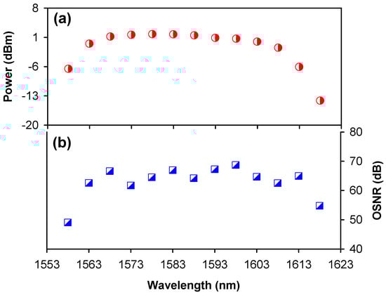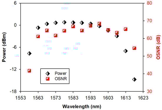 Figure 3 also presents the optical signal-to-noise ratio (OSNR) and output power detected for this EDF ring laser at different lasing wavelengths, from 1558.0 to 1618.0 nm. The output power and OSNR of the EDF laser were between −14.73 and 0.78 dBm and 46.72 and 68.44 dB, respectively, within an available wavelength-tuning bandwidth of 60 nm. The largest and lowest output power of 0.78 and −14.73 dBm was at the lasing wavelength of 1578.0 and 1618.0 nm with OSNR of 64.39 and 54.50 dB, respectively. However, the minimum OSNR of 46.72 dB was at the output wavelength of 1558.0 nm. Moreover, a flat power output profile with 1.01 dB power fluctuation [ΔP = 1.01 dB (Pout = −0.23~0.78 dBm)] could also be reached over a useful bandwidth from 1568.0 to 1598.0 nm (BW = 30 nm) and the corresponding OSNR was between 61.66 and 68.44 dB, as displayed in Figure 3. Due to the flattened ASE and gain distribution of the original L-band EDFA, the presented EDF laser could also reach a flat power output bandwidth of 30 nm. In general, to achieve flattened power output operation of the fiber laser, adjusting the pump power of the laser diode (LD) of EDFA and using the corresponding optical filter were the common methods. This also means that the proposed laser does not require other controls and operations to achieve flat power output.