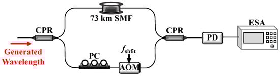 To obtain the stable single-longitudinal-mode (SLM) output, fiber lasers have been designed with several constructions, such as the distributed feedback (DFB) [], distributed Bragg reflector laser (DBR) [], and typical linear and fiber ring cavities [,]. As mentioned above, the fiber ring lasers are the most important, because the ring cavities possess the capability to evade spatial gain hole-burning in the linear fiber cavity by applying an intra-cavity isolator and allow us to insert more optical devices for specific operations []. Therefore, erbium-doped fiber (EDF) lasers exhibit output characteristics, such as narrow linewidth, high optical signal-to-noise ratio (OSNR), low phase noise, single-longitudinal-mode (SLM) and long coherence length [,]. Due to the above-mentioned properties, the EDF lasers can also be used in many fields and applications, such as optical sensors, optical communications, bio-photonics, microwave (MW) photonics, optical spectroscopy, and instrumentations [,,,,]. However, the homogeneous broadening of erbium, mode-hopping, and long fiber cavity length could lead to multi-longitudinal-mode (MLM) oscillation which exists in fiber lasers []. Thus, to solve and eliminate the MLM noise of the EDF laser, different technologies have been proposed [,,,,], such as using the unpumped EDF saturable absorber (SA), multiple fiber ring structure, utilizing narrowband fiber Bragg gratings (FBGs), inserting Rayleigh backscattering (RB) injection, and applying a Mach–Zehnder interferometer (MZI)-based filter to the fiber cavity.