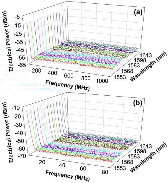 Detected electrical spectrum of the wavelengths from 1558.0 to 1618.0 nm at 5 nm measurement intervals in the frequency range from (a) 0 to 1000 MHz and (b) 0 to 80 MHz by self-homodyne observation, respectively.