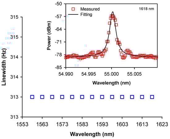 Then, we employed the delayed self-heterodyne method through the same MZI setup to measure the linewidth of the first EDF laser, as displayed in Figure 4. In the measurement, a 55 MHz shift frequency (fshift) was applied to the acousto-optic modulator (AOM) to generate the beat signal for linewidth detection. The PC was applied to control and attain the optimal beat signal performance for the experiment. Primarily, a lasing wavelength of 1618.0 nm was utilized for self-heterodyne setup for measurement. The electrical linewidth spectrum measured at the wavelength of 1618.0 nm at a center frequency of 55 MHz is shown as the red square symbol at the top of Figure 6 through the ESA. To realize the definite laser linewidth at 1618.0 nm wavelength, a Lorentzian fitting curve can be applied based on the measurement results. Thus, a 3 dB Lorentzian linewidth of 313 Hz was obtained at 1618.0 nm wavelength and plotted in the solid line at the top of Figure 5 through profile fitting. The square symbols and solid lines at the top of Figure 5 are used to distinguish between measured and fitted results. The Lorentzian linewidth at 1618 nm wavelength was maintained at 313 Hz during 40 min of monitoring. Next, we also measured and obtained the corresponding 3 dB Lorentzian linewidth of other output wavelenghts via the same measurement over the full tunability bandwidth from 1558.0 to 1618.0 nm. Furthermore, the measured Lorentzian linewidths from 1558.0 to 1618.0 nm with 5 nm wavelength intervals were all at 313 Hz in the blue square symbols at the bottom of Figure 5. We confirmed that this EDF laser architecture can achieve a linewidth of 313 Hz within the effective wavelength output range. Therefore, the above results indicate that the cascaded EDF-based SA filter and feedback RB injection effect inside a fiber cavity can acquire stable SLM output and narrow sub-kHz linewidth.