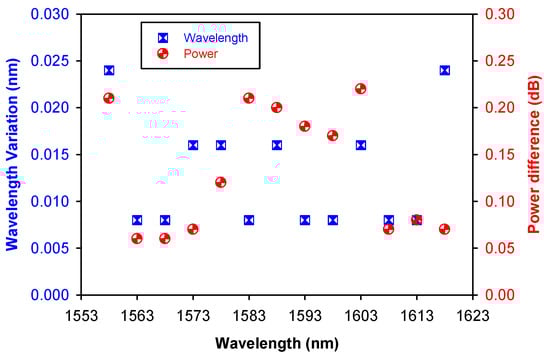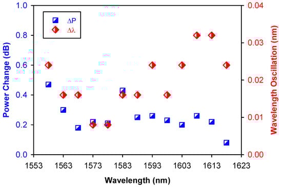 In addition, the steady output of each generated wavelength in the EDF laser structure is also a noteworthy cause. To realize the real instabilities of the first designed EDF laser configuration, we also applied thirteen selected output wavelengths with a 5 nm tuning step in the tunability bandwidth from 1558.0 to 1618.0 nm. As displayed in Figure 7, the output power and center wavelength fluctuations of the proposed EDF laser were also measured through a 40 min observation time. In the available tuning bandwidth, the largest and smallest variations in each output power and wavelength were between 0.47 (at 1558.0 nm) and 0.08 dB (at 1618.0 nm), and between 0.032 (at 1608.0 nm) and 0.008 nm (at 1573.0 nm), respectively, as seen in Figure 7. Therefore, this demonstrated that the L-band EDF laser structure can achieve high stability in output power and center wavelength over the whole wavelength-adjusting bandwidth.