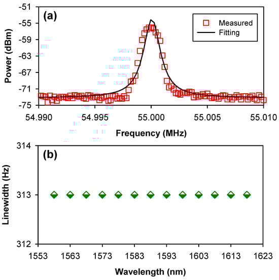 Then, to understand the obtained linewidth of the second fiber laser, the self-heterodyne and Lorentzian curves were applied for measurement. We also used the 1618.0 nm wavelength for the linewidth measurement via the self-heterodyne first. Figure 10a shows the measured linewidth profile and Lorentzian curve of the electrical spectrum when the shift frequency (fshift) of 55 MHz was added to AOM. Thus, the 3 dB Lorentzian linewidth of 313 Hz could be obtained through fitting. In the observation, the other 3 dB linewidths of the second laser were all 313 Hz under the Lorentzian fit, as displayed in Figure 10b. As stated above, the first and second EDF laser configurations had the same 3 dB linewidth of 313 Hz. However, there were some differences in other output characteristics.