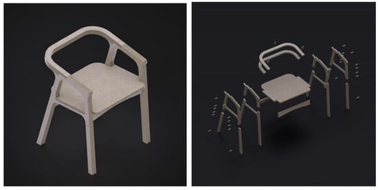 Thus, the starting point for the development of the proposed mediating artifact was the choice of the model to be used for the study. To do so, the product proposed for the study had to meet two main characteristics: having more than one construction/assembly stage and belonging to the scenographic production repertoire. Therefore, a furniture item—the Plywood Chair—was used for automated execution in a CNC Router, which improves automation and flexibility in the warehouse, with multiple parts and fitting and assembly stages. The files contained are SVG files to be cut directly with CNC or printed and cut with a bandsaw. The SVG files are exported from the chair modeled in 18 mm or 3/4 inch (19.05 mm) plywood. The SVG files cannot be used with any other plywood thickness. To use thinner or thicker plywood, the model needs to be modified according to that thickness. Figure 2 shows the final optimized 3D model of the Plywood Chair for use in Web AR, respecting the previously established requirements.