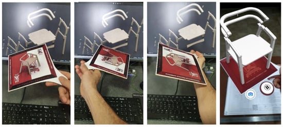 The demonstration of the four sheets was performed using the Galaxy S10 Plus, with a 4G connection. The demonstration of Sheet 1—Introduction to the model—verified important parameters for the execution of AR, such as estimation of the real distance of the 3D model in scale in the real world, estimated by ARCore. This capability was confirmed by measuring the model in real size projected with a ruler placed under the object (with a margin of error of 0.5 to 1 cm). In terms of the capability to track occluded objects, the platform was able to recognize objects and surfaces with delays of 1 to 2 s when exposed in the foreground, i.e., closer than the positioning of the artifact—generally quite satisfactory. Regarding the functional integration, the artifact can (in the demonstration) maintain the same conventional reading behaviors of the physical design template, except for the fact that it is viewed through the smartphone, resulting in little change in the operating mode. Figure 6 demonstrates the use of AR for Sheet 1, visualizing the projected product in the real world, while Figure 7 demonstrates how the person manipulated the cell phone for visualization of the augmented TD.