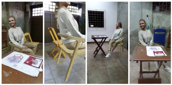 Figure 8 demonstrates the AR experience using a female reference model measuring 1.70 m. The tests positively evaluated the responsiveness of the algorithm in interpreting foreground objects, further integrating the projected 3D model and the intended use of the artifact. The use of the ergonomic reference contributed to the understanding of the product, as there was an initial perception that the artifact would be excessively smaller or in a reduced scale.