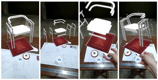 The following demonstration aimed to verify the animated 3D model of Sheet 3—exploded view. The animation transitions between the object and the exploded view, seeking to drastically reduce cognitive load []. As previously mentioned, the model with native material and a visual appearance similar to the detail sheet was used, along with the Play/Pause button. Figure 12 shows the simulations of using the tangential board in relation to the TD sheet and the workspace. The user can pause the model explosion at any point during the transition to study the relationship between the parts or the fittings of each item, relying on the intuition of static or dynamic interactions.