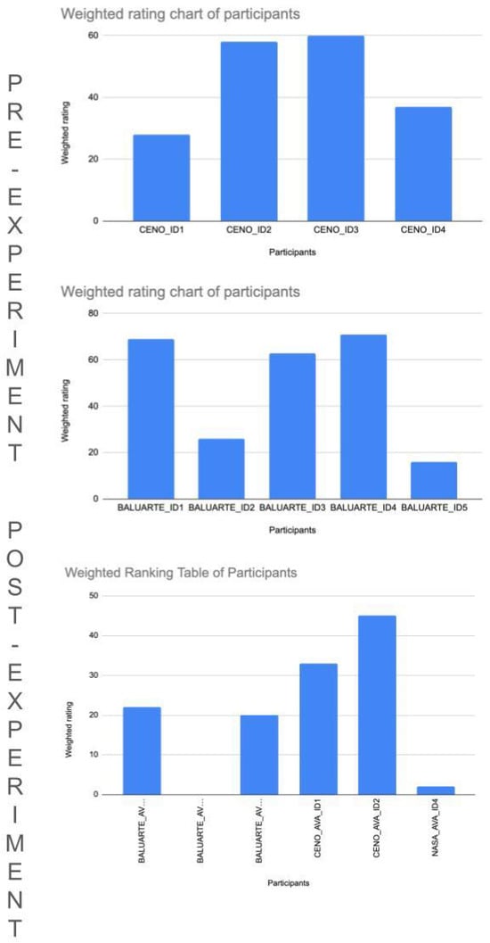 Among the recurring individuals in Groups 1 and 2 are the following participants: Production Manager (Ceno Mais), Production Manager (Baluarte), and Executive Director (Baluarte), as illustrated in Figure 13. The weighted ratings from NASA-TLX (post-experiment) were 36, 18.67, and 20 points, respectively. These were significantly lower than the ratings in NASA-TLX (pre-experiment), which were 58, 26, and 67 points, respectively. This illustrates reductions of 62%, 70%, and 29.9%, respectively, in the workload index. With these data, a general weighted average reduction of 53.9% is observed among the recurring participants.