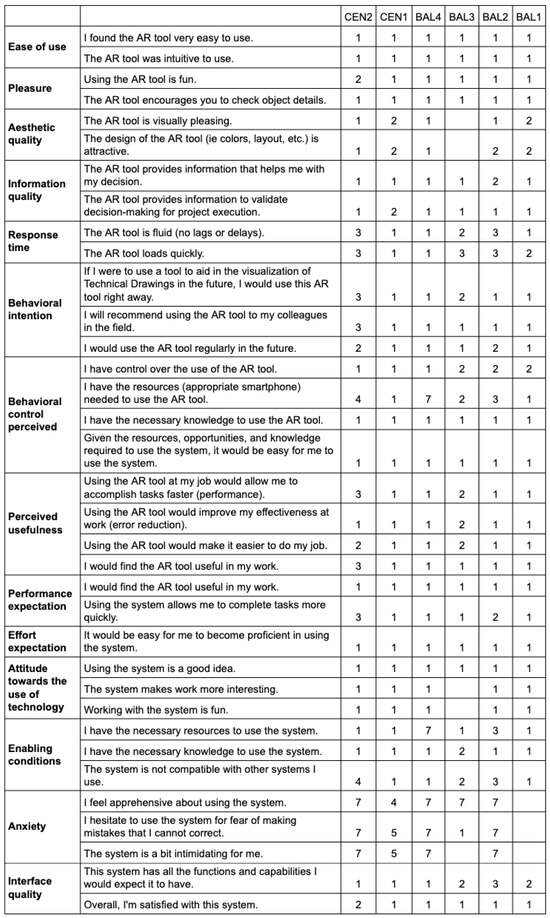 The objective questionnaire, consisting of 37 items, was administered to evaluate user satisfaction with the Augmented TD. It was given after the interaction with the artifact, allowing participants to express their agreement. The questions are structured using a 7-point scale. Low scores are better than high scores due to the anchor points used (completely agree/completely disagree), except for the anxiety construct (where higher scores are better, due to the phrasing of the negative statements). Figure 14 presents the compilation of results—the Technology Acceptance, Intention, and Use Questionnaire; the graph shows the agreement scale for each participant, with their data compared column-wise.