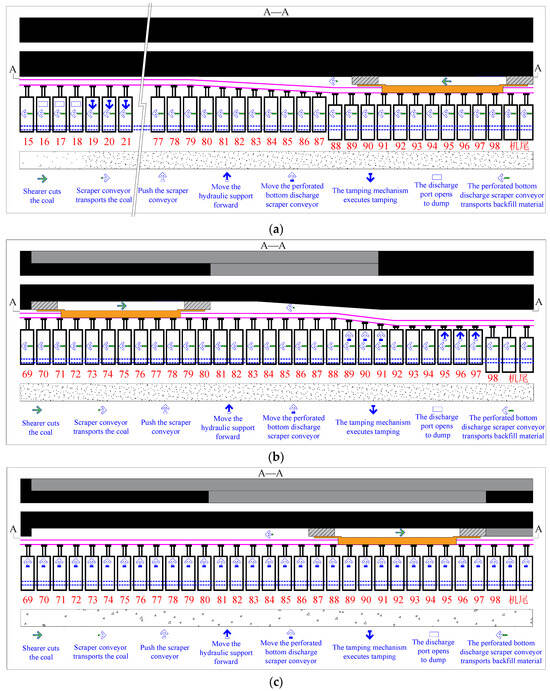 For the whole backfilling working face, the optimal operation implies achieving parallel, autonomous execution of the mining and filling processes through the shearer, scraper conveyor, hydraulic supports, and perforated bottom discharge scraper conveyor. For this purpose, one should ensure that the equipment and mechanisms executing different mining and filling processes do not interfere with each other and fulfill specified functions in a spatially and temporally organized manner. The spatial sequence refers to an appropriate spatial alternation of processes executed by different equipment at different frame positions in the working face. Temporal sequence refers to the chronological order of specific processes involving different mechanisms within a specific frame, which are organized temporally to complete the mining and backfilling operations. Based on the above principles, this study designed the cyclic parallel mining and backfilling operations in the fully mechanized mining face, as shown in Figure 6.