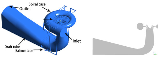To analyze the flow characteristics, we constructed a three-dimensional model encompassing the entire flow channel of the unit (Figure 2), which was then subjected to meshing. The boundary conditions were established based on measured data, and we conducted flow calculations for the runner to evaluate the impact of radial deviation clearances on the turbine unit’s flow characteristics.