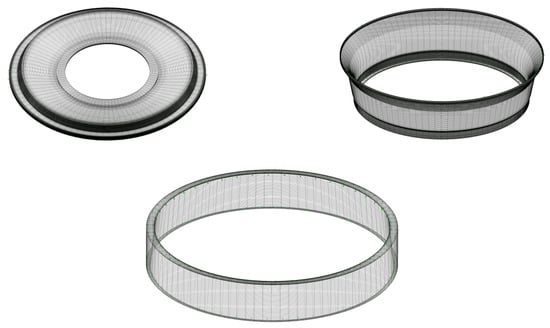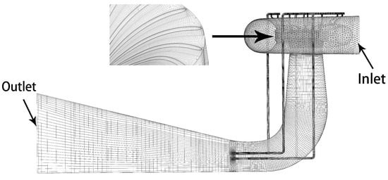 In order to create the model with radial deviations, we made adjustments to the crown chamber, bottom ring chamber, and vaneless space models based on the ideal model (Figure 4). Specifically, we displaced the runner in the negative Y-axis direction by increments of 0.1 mm, 0.3 mm, 0.5 mm, 1.5 mm, and 2.5 mm, respectively. The mesh we employed is structured and consists of approximately 830,000 elements (Figure 5).