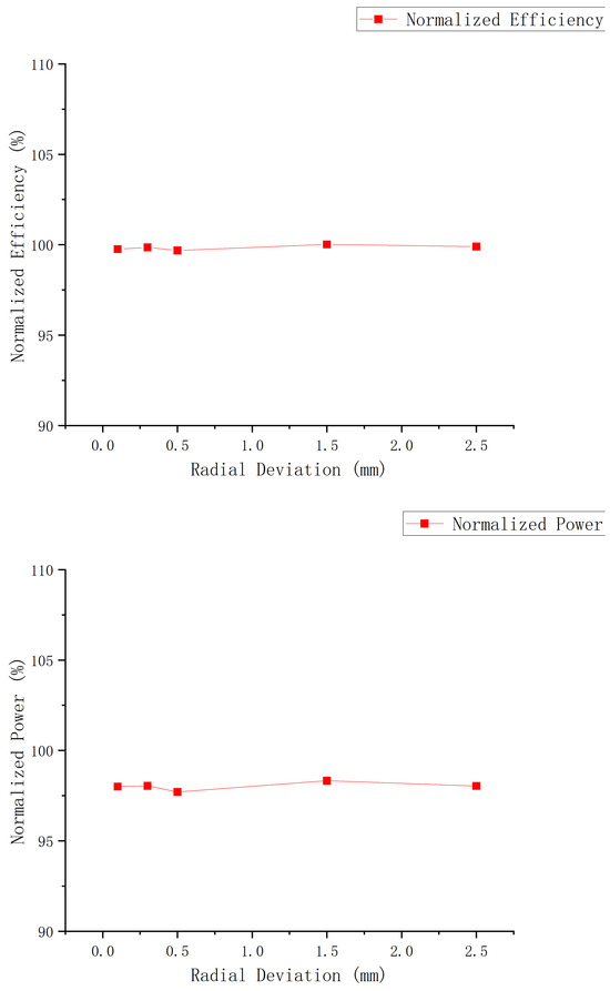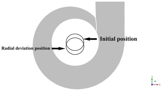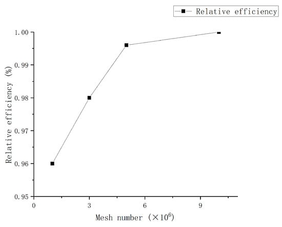 To ascertain mesh independence, we generated meshes for the entire flow domains in Figure 3 while applying the boundary conditions corresponding to rated working conditions. As indicated in Table 2, there was no significant difference in efficiency between the two cases. Consequently, we chose to utilize the mesh with 5 million elements for subsequent calculations to reduce the computation time. For a more comprehensive validation of grid independence and parameter comparison, we refer readers to another article [] authored by our team, which specifically validates grid numbers under unbiased ideal conditions. The radial deviation grid examined in this article is built upon this foundation, ensuring that the total number of deviation grids, after adjustment, closely aligns with the total number of grids in the unbiased ideal model.