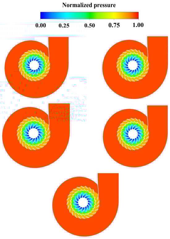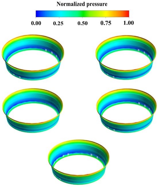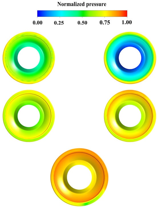 As for the pressure distribution in the bottom ring chamber, it is illustrated in Figure 12. Upon comparing the five radial deviations, it becomes evident that there is no significant alteration in their pressure distribution. The only notable difference is observed in the low-pressure region at the minimum clearance, where the pressure is slightly higher than at the maximum clearance. This discrepancy arises because the clearance in the bottom ring chamber is approximately 0.2 mm smaller than that in the upper crown chamber. Consequently, the bottom ring chamber does not exhibit a transition from a high-pressure region to a low-pressure region as seen in the upper crown chamber at its minimum clearance.