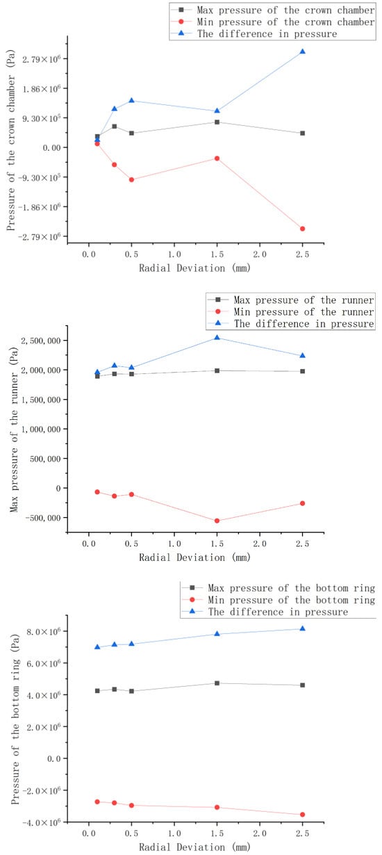By combining the maximum and minimum pressures of the three components, as well as their pressure differentials (Figure 13), it can be observed that an increase in radial installation deviation leads to higher pressure values for each component. However, the differentials between pressures do not undergo significant changes. In contrast, the upper crown chamber exhibits substantial pressure fluctuations at 1.5 mm and 2.5 mm deviations. This aligns with previous findings, confirming that the upper crown chamber is more affected than other components, resulting in increased instability in pressure with increasing deviation.