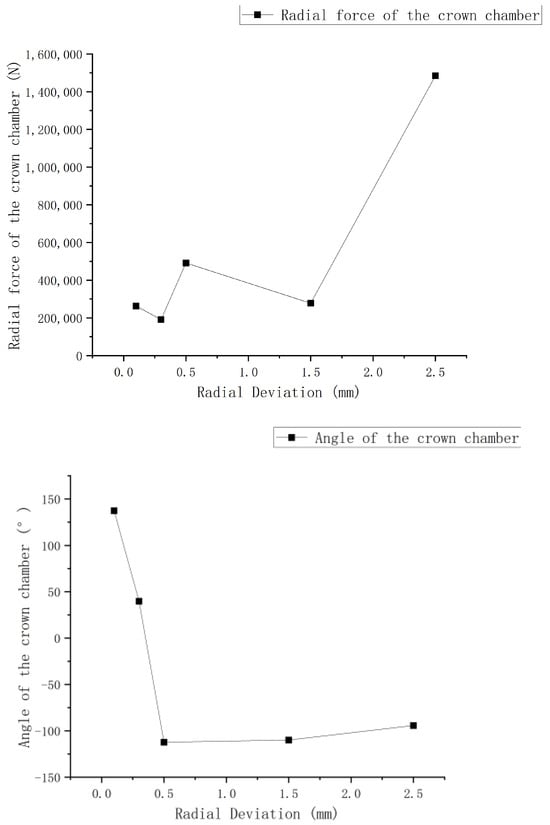 From Figure 14, it can be observed that the magnitude of the radial force on the upper crown remains relatively stable in the first four scenarios. However, in the case of a 2.5 mm deviation, there is a sudden increase in this force. By examining the pressure distribution, it can be inferred that in the 2.5 mm deviation scenario, there is a notably low-pressure zone in the lower part of the upper crown (depicted in light blue) compared to other scenarios. This leads to excessively high pressures on the corresponding side, resulting in an increased radial force. The radial force angle plot further confirms this situation.