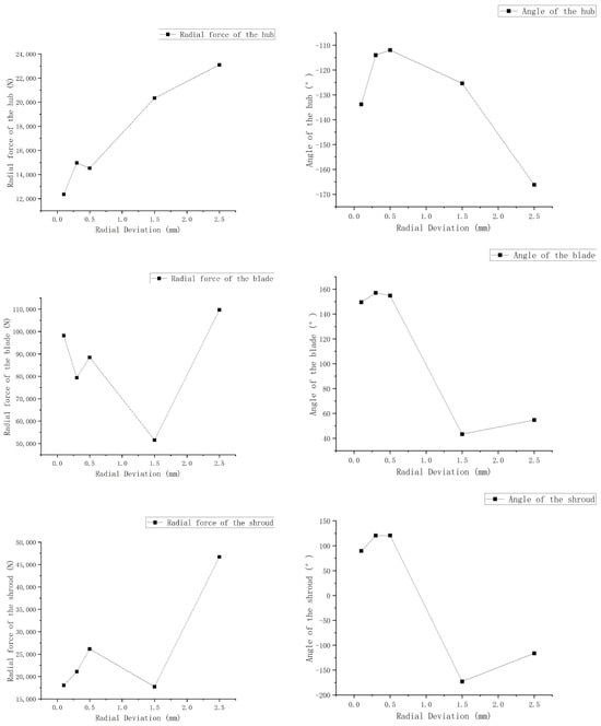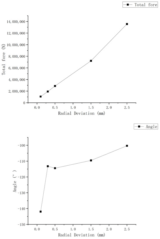 Finally, by examining the resultant force (Figure 17), we can conclude that radial forces increase with the expansion of radial clearances. Notably, beyond 0.5 mm, the increase becomes nearly linear. Additionally, the direction of the force gradually shifts from the left side of the clearance to the right.