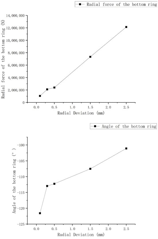 As shown in Figure 16, it exhibits a relatively straightforward pattern compared to other components. As the deviation increases, the radial force gradually grows, almost in a linear fashion. Simultaneously, the angle shifts from the left side of the clearance to the right side, yet consistently remains in the negative half of the y-axis. When considering the magnitude of radial forces across all components, it becomes evident that the lower ring experiences the highest radial force, with a substantial difference in magnitude compared to other components.