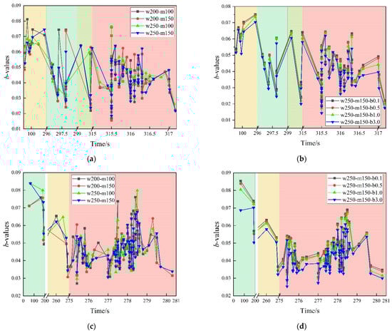 Because the b-value is derived from statistical analysis (only related to AE event time and magnitude), the data window width (abbreviated as “w” in the following figures), moving step length (abbreviated as “m” in the following figures), and bin width of magnitude (abbreviated as “b” in the following figures) are thus important factors influencing the speed and accuracy of calculations. Based on the previous works [], the suggested minimum AE event number for severity estimation is 200; we thus set the data window width to 200 and 250 and set the moving step length to 100 and 150.