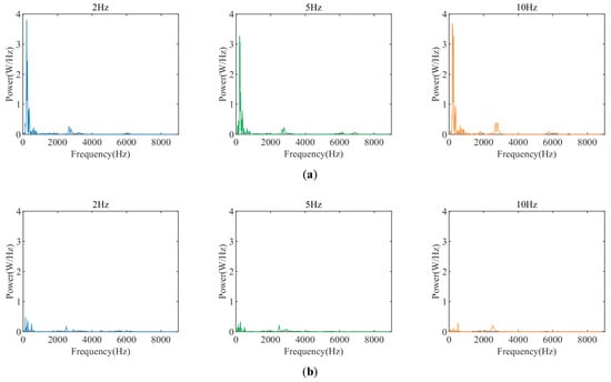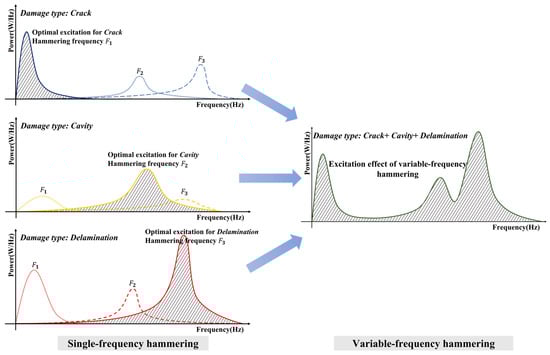 Acoustic investigations of hammering tests have often concentrated on the analysis of single-frequency hammering’s acoustic features [], determining damage on the basis of variations in the excitation effect obtained by hammering the detection area. The excitation effect obtained by hammering the detection area is reflected acoustically using the power spectral density (PSD) [], as depicted in Figure 1, which is a PSD schematic diagram of single-frequency and variable-frequency hammering to determine the excitation effect of the detection area.