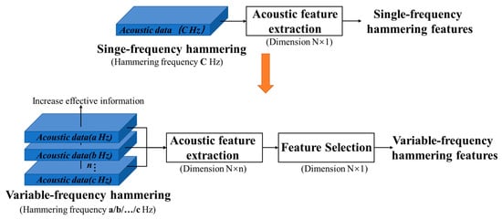 Therefore, an identification method based on variable-frequency hammering is proposed in this study. As shown in Figure 2, for the existing single-frequency hammering method, the acoustic data obtained from the single-frequency hammering and extracted acoustic features were used for machine learning. In this study, the acoustic data of multiple hammer frequencies obtained with variable-frequency hammering were used to increase the effective information in the vertical direction, as shown in Figure 2. The acoustic features were obtained by acoustic feature extraction, and the dimension was then reduced to the same dimension as that of the single-frequency hammering through feature selection; finally, the selected features were used for machine learning. This study aims to increase the valid acoustic information for concrete damage classification without increasing the acoustic feature dimensionality or causing a dimensional disaster.