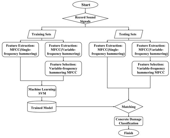 The flowchart of the proposed method is shown in Figure 3. After recording the acoustic signal using a microphone, it was divided into two processes: training and testing. The first process is the training process, including the use of Mel-frequency cepstrum coefficients (MFCCs) were used for feature extraction of acoustic signals obtained from single-frequency and variable-frequency hammering and feature selection of MFCCs for variable-frequency hammering. Subsequently, SVMs were used to model the MFCCs for single-frequency and variable-frequency hammering. During the testing process, the MFCCs of single-frequency and variable-frequency hammering after feature selection were matched with those of the established model. In this study, two different models were established and compared based on single-frequency and variable-frequency hammering.