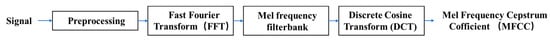 Figure 5 shows the general process for determining MFCCs. There are four steps: preprocessing, fast Fourier transform (FFT), Meier frequency filtering, and discrete cosine transform (DCT).