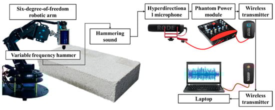 The main automated hammering device used in this study included a voltage-controlled solenoid hammerhead that can automatically hammer at different frequencies, six-degree-of-freedom robotic arm to guide the hammerhead, and radio device consisting of a directional microphone, microphone power module, wireless transmission, and computer []. The automatic hammering device ensures that the hammering position and hammering acoustic data obtained are sufficiently standardized, and that the hammering acoustic data obtained by hammering at different frequencies can be used for machine learning, as shown in Figure 6.