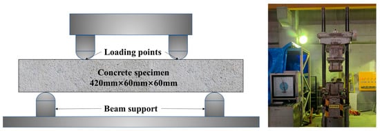 Concrete specimens with a length of 420 mm, width of 60 mm, and height of 60 mm were used in this experiment. The concrete specimen was bent through a four-point bending system, as shown in Figure 7, producing damage distributed over the entire specimen as in Figure 8 and Figure 9. In this study, the formation of damage classification is divided into two types: two-category, as shown in Figure 8, and four-category, as shown in Figure 9. The entire sample was divided into 21 groups. In the two-category classification, the concrete samples were divided into healthy and damaged areas. The healthy area was not damaged within 20 mm, and the damaged area included surface and internal damages. In the four-category classification, the samples were divided into healthy areas with no damage within 20 mm, surface damage areas with only surface cracks within 20 mm, internal damage areas with only internal cracks within 20 mm, and compound damage areas with both surface and internal cracks within 20 mm. Acoustic data were obtained by hammering the concrete from above at a hammering frequency of two times per second (2 Hz), five times per second (5 Hz), and 10 times per second (10 Hz). In the two-category and four-category classification, the concrete was subjected to 1260 hammer blows at 2 Hz, 3150 hammer blows at 5 Hz, and 6300 hammer blows at 10 Hz. The sound acquisition device is directional, pointing vertically in the hammering direction and moving with the hammering to ensure that the sound propagation distance does not need to be corrected.