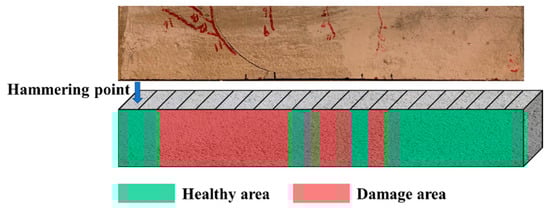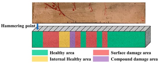 Unlike with the traditional hammering method, the proposed variable-frequency hammering method does not start with acoustic processing, which improves the useful information that can be used to identify the damage by activating the detection area with various hammering frequencies. On the right-hand side of Figure 1, a schematic representation of the acoustic data obtained using the variable frequency hammering method is illustrated. To identify more intricate damages, the excitation effect produced by altering the hammering frequency allows the highest number of shaded sections to be obtained. This provides the biggest informational contrast with other detection areas.