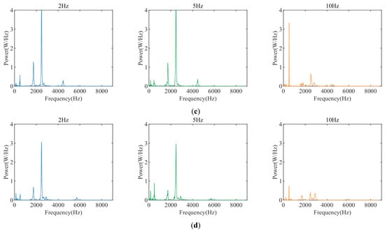 The PSD of the selected signal under different conditions was obtained for the frequency-domain analysis. As shown in Figure 10, the power was concentrated at 0–2000 Hz for the healthy category shown in Condition 1. Under different hammering frequencies, the power distribution did not change significantly with the hammering frequencies. In Condition 2, the shallow cracks (surface damage) were concentrated in the range of 0–4000 Hz. Under different hammering frequencies, the distribution of the power size with hammering frequency change was not obvious. At the crack extension of Condition 3 (internal damage), the power was concentrated at 0–3000 Hz and 4000–5000 Hz, and the variation in power magnitude was evident under different hammering frequencies. At the compound damage of Condition 4 (internal damage + surface damage), the power was concentrated at 0–3000 Hz, and the variation in power magnitude was evident under different hammering frequencies. Four different types of damage with different power distributions in the same component can be easily distinguished by vertical observation. However, for Condition 3 at crack propagation and Condition 4 at composite damage, the power of these two adjacent damages under the same fixed hammering is concentrated in the same frequency distribution. As a result of using variable-frequency hammering, the power change in Condition 3 in the frequency distribution was significantly different from that of Condition 4. The change in Condition 3 was significant at 0–1000 Hz, and that of Condition 4 was significant at 2000–4000 Hz. The frequency distribution of the power changes in Condition 3 was significantly different from that of those in Condition 4. Condition 3 showed a significant change at 0–1000 Hz, while Condition 4 showed a significant change at 2000–4000 Hz. With single-frequency hammering, the difference was more pronounced for the two categories of health and damage. However, acoustic signals obtained by hammering at different frequencies can differentiate between two or more similar damage classifications.