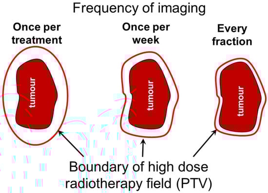 The size of the high therapeutic dose region of the treatment field is typically larger than the tumour, as defined by the clinical target volume (CTV) and planning target volume (PTV) concepts [,]. The CTV expands directly from the tumour or gross tumour volume (GTV) to account for any cancer cells lying on the periphery of the tumour. The PTV expands from the CTV to account for internal motion and variations in shape of the tumour, and the uncertainties in patient position during radiotherapy treatments. The treatment dose and PTV margin are adjusted to maximize the chance of cancer cure, while minimizing the probability of complications by maintaining doses to nearby organs at risk (OARs) below their respective tolerance doses []. When a patient is set up for treatment, images are acquired, and then compared and aligned with the planning images of the patient to reduce positional uncertainty. Pre-treatment imaging allows the size of the high-dose margin to be reduced (Figure 1). Set-up images are frequently recorded at many, if not all, of the fractions in which treatment is delivered. Cases involving motion management or high-dose treatments might also require intra-fraction imaging. This enables changes in patient anatomy to be monitored during treatment, and allows corrections to be made to treatment delivery if required. The process of using images in planning treatments and then taking further images at the time of treatment to guide the delivery is referred to as image guided radiation therapy (IGRT). Additional imaging during treatment planning and delivery can also be used to account for motion, with the recording of multiple images through breathing or other motion cycles.