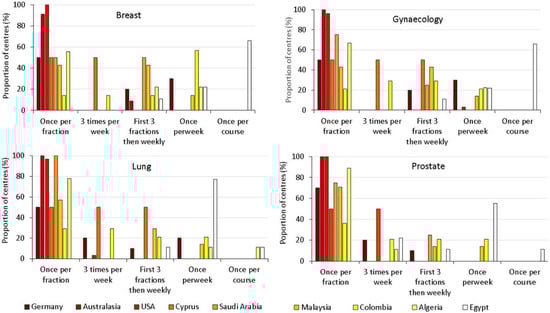The frequency of advanced imaging (i.e., CT, kV- and MV-CBCT, and fluoroscopic imaging) has a significant impact on the trade-off between doses to tissues surrounding the target from the therapy beam and those from imaging exposures. When a misalignment is identified by IGRT, the patient is typically repositioned to correct this and, in some cases, imaging may be repeated []. Increasing the number of fractions in which imaging is performed will reduce the likelihood of undetected patient alignment errors which could decrease the success of radiotherapy or lead to radiation injury to healthy tissue. The most common option used for all treatments was imaging at every fraction (Figure 2), as this ensures that delivery of treatment is as accurate as possible. A study of lung cancer treatments undertaken with varying frequencies of on-board mega-voltage CT (MVCT) imaging concluded that performing IGRT less than daily increased the rate of geographic misses when small (3 mm) uncertainty margins are chosen and recommended to increase such margin to ≥5 mm when imaging less frequently [].