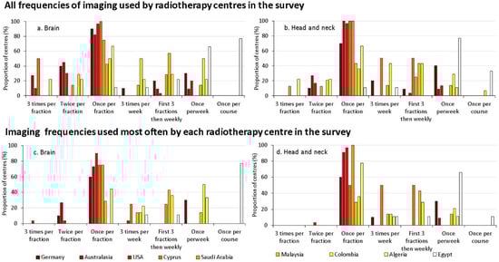 The frequencies of imaging used more commonly by each radiotherapy centre during treatment of the brain (a,c) and head and neck tumours (b,d), as a proportion of the centres surveyed in the country; (a,b) representing all the frequency options used, and (c,d) the ones used most frequently []. The countries are ordered using a temperature scale from white to dark red indicating increasing HDI.