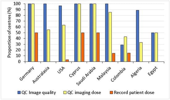 Proportion of radiotherapy centres in each country carrying out QC tests on image quality and dose, and those recording patient dose quantities [].