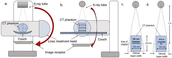 Arrangement being used for measurement of cumulative dose at the centre of a CT body phantom. The X-ray source and image receptor are typically mounted at 90° from the treatment head of a medical linear accelerator. The figure shows schema of the measurement set-up in (a) the axial plane and (b) the sagittal plane. Measurements would be made with in a CT standard phantom with (c) a 100 mm CTDI ionization chamber and/or (d) a 0.6 cc Farmer type ionization chamber.