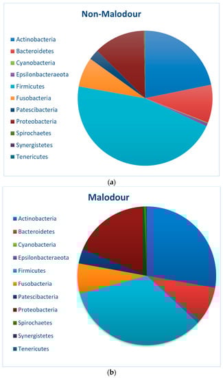 Microbial abundance at phylum level for (a) non-malodor samples and (b) malodor samples.