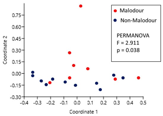 Principal coordinates analysis (PCoA) shown in Figure 3 demonstrates the level of similarity between the microbial population of the malodor and non-malodor samples. This analysis showed that the differences between these two groups were statistically significant (p = 0.038, F = 2.911, PERMANOVA).