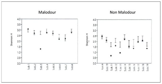 Diversity analysis (Shannon diversity index) conducted on the microbial populations sampled from the malodor and non-malodor groups.