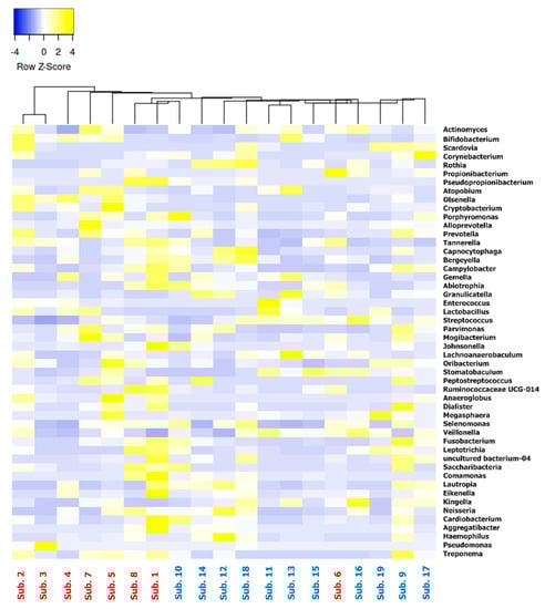 Heat map clustered according to genera found within the samples and ordered according to their relative abundance. Subjects (malodor—red; non-malodor—blue) are clustered according to genera found in each sample.