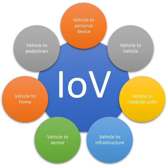 The number of vehicles connected to the Internet of things (IoT) is increasing drastically, thus providing the means for vehicle information to be accessed ubiquitously by drivers and passengers. As a result of the increasing number of connected vehicles, new requirements of vehicular networks are emerging, such as a secure and seamless exchange of scalable information between vehicles, humans and roadside infrastructure. This has revolutionized the vehicular ad hoc networks into the IoV []. The IoV is transforming as a new emerging research theme and developing from the concept of vehicular ad hoc networks []. It is the IoT that drives the revolution of vehicular ad hoc networks into the IoV []. In view of the technological advancement in communication systems, vehicles are no longer just a simple means of transportation due to the development of mobile networks and the automotive industry. Vehicles that are connected with sensors, computers, radars, GPS antennas, etc. have the capacity to collect and process a large-scale amount of data as a result of vehicle-to-vehicle communication []. Other forms of communication that exist in the IoV environment includes vehicle-to-roadside, vehicle-to-infrastructure, vehicle-to-personal device, vehicle-to-sensor, vehicle-to-pedestrian [,,]; and vehicle-to-home [], as depicted in Figure 1.