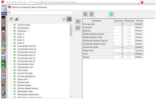 To collect data for the vehicle collision in the IoV, the environment was created in the VISSIM before generating and collecting the data for vehicle collision. The IoV environment was created for different scenarios. The configurations of the IoV environment in the VISSIM are described as follows: The IoV architecture covers 1500 × 1500 m for a single vehicle lane road comprising bends, multiple lanes, speed distribution, an area with speed restriction, signal controllers, the view of the IoV in both 2D and 3D with a minimal speed, average speed and maximum speed of 50 km/h, 95 km/h and 140 km/h, respectively. Approximated vehicular mobility traffic was between 30 and 180 vehicles. The vehicles in mobility for the traffic signal heads to the controller showing the signal light displaying green, red and amber. The IoV environment was reconfigured for different scenarios to capture the low-speed distribution required on the roads and the number of vehicles on the road moving to different zones. The low-speed zone on the road varied between 5 km/h and 50 km/h, with a varied number of vehicles moving into different zones []. The features for the vehicle collision in the IoV were as follows: Driving state, clearance, spacing, safety distance (gross), safety distance (net), following distance (gross), following distance (net), interaction state, delay time, lane and speed, as indicated in Figure 2. Finally, the features used in the study were as listed as number of lanes, status of the driver, nature of the environment, velocity of the vehicle, distance between vehicles and breaking capability. Figure 2 shows the configuration of the features influencing vehicle collision in the IoV simulated in the VISSIM environment.