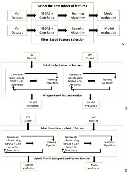 This study used multi-objective feature selection that evaluates a group of features concurrently. The NSGA3, along with the GR as the filter evaluation measure and bi-directional, is used for the selection of IoV collision features with the most significant informative subset features. For the purpose of comparison within the family of NSGA, NSGA2 with the GR and bi-directional is used across filter-, wrapper- and hybrid-based feature selection methods for the selection of features influencing vehicle collision in the IoV.