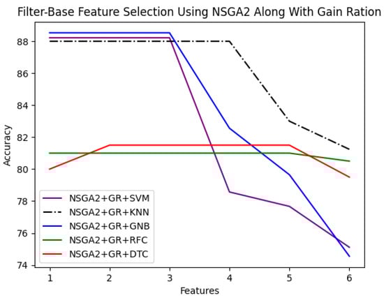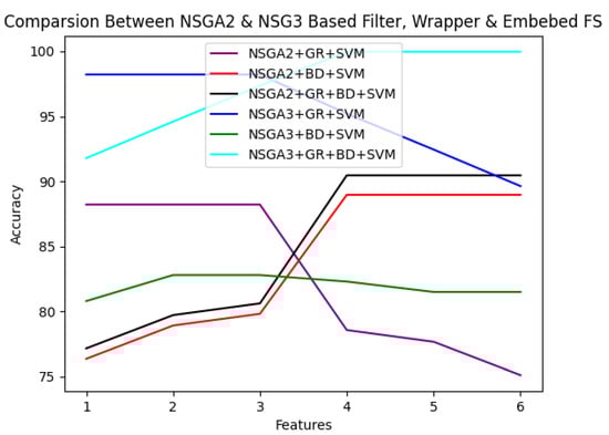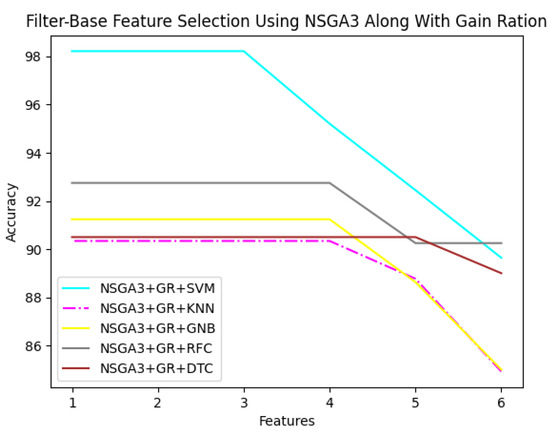 Typically, the GR gives priority to the features that have large values, making the GR biased towards the large number of values. The combination of feature 1 and feature 2 has better potential than feature 1 or feature 2 alone, meaning that the combination is better than the constituent features. Split information is mostly used to deviate from the bias []. Feature selection can be filter, wrapper or hybrid. Filters select the best subsets of features by ranking all the features, and features with high classification performance are chosen at the detriment of others. Hence, there is no dependency among the subsets of features that are chosen. Filters are computationally fast since there is no interaction among the selected subsets of features. On the other hand, wrappers are computationally expensive since, for each subset of features that is selected, the learning algorithm must be included to determine the performance of the chosen features. In this study, NSGA2 developed by Deb et al. [] and NSGA3 introduced by Mkaouer et al. [], along with the GR as the filter evaluation criterion, are used to solve the issue of dependency among selected subsets of features. GR-based filters are now becoming popular in solving various multi-objective optimization problems in feature selection [].