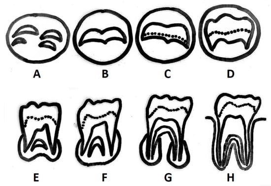 Dental developmental stage according to Demirijian et al. []: (A) beginning of crown formation; (B) the complete and fused tooth crown can be clearly seen; (C) half of the crown is complete, and the formation of the pulp chamber can be discerned; (D) the crown formation is completed; (E) the beginning of the formation of the furcation can be discerned, and the length of the root is smaller than the length of the crown; (F) the length of the root is at least the same as the length of the crown; (G) developed and parallel root walls can be seen, but the apexes are open; (H) the root apexes are closed.