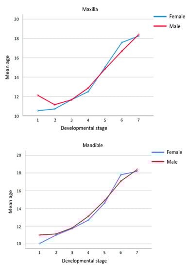 In order to characterize the possible differences between males and females, a two-way ANOVA was executed. Statistical significance was found for the developmental stage (p < 0.0001) with no statistical significance for gender (p = 0.409 for the maxilla and p = 0.368 for the mandible). The only difference was seen in stage 1: girls reach stage 1 at an earlier age (around 10 years in girls, and 11–12 years in boys). Figure 2 shows the marginal means for males and females in the maxilla and mandible, according to tooth developmental stage.